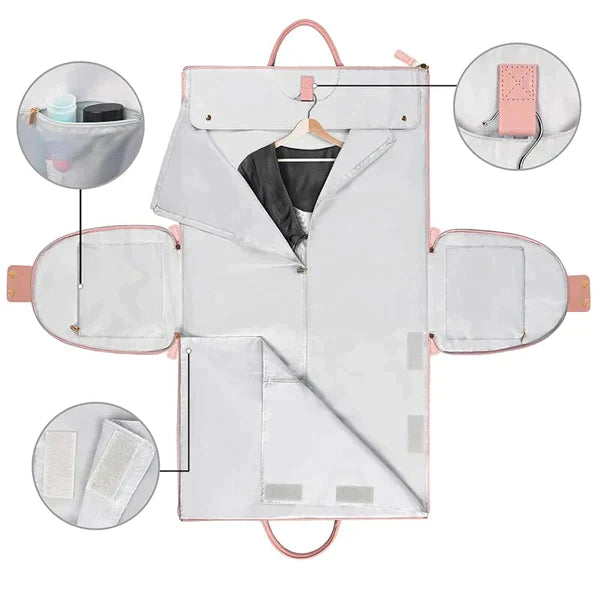 This can be used as a great travel bag for special occasions such as a holidays, weddings, or any occasion you may be taking your best outfits along with you. Inside of our bag, there are several ways to fasten your clothing in a fixed position before folding it up for travel.
